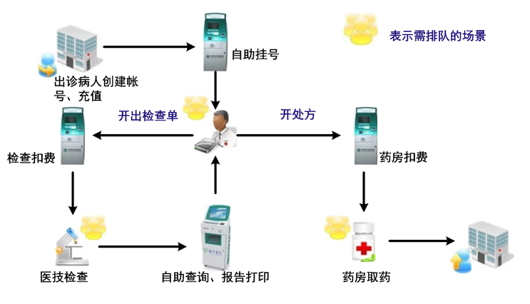 我国的大医院长期存在群众意见极大的看病“三长一短”问题,即挂号排队时间长、候诊时间长、缴费取药时间长、就诊时间短。针对此类现象,卫生部提出医院应“优化服务流程,提高医疗资源利用效率”,开展“先诊疗,后结算”的新型付费模式,在尊重患者传统诊疗付费习惯的基础上,利用现代信息技术,优化门诊流程,提高医院的诊疗效率和服务质量,缓解患者“挂号难、看病难”问题,解决医院“三长一短”,方便患者就诊、增加患者满意度。